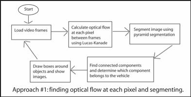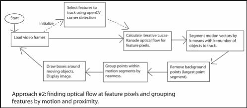 The first approach (see “Approach #1" at right), used the OpenCV implementation of the Lucas-Kanade optical flow algorithm to determine independent x,y motion components at each point of the grayscale image. The x and y vector components were merged into one image using the red and blue channels to hold each component. Color segmentation using pyramids (cvSegmentPyr() in openCV) was performed on the composite red-blue image in an attempt to segment out objects moving with unique motion vectors. The results of this technique were poor, as the motion vector image was too noisy. Thus, further refinement was necessary and a second method was implemented.