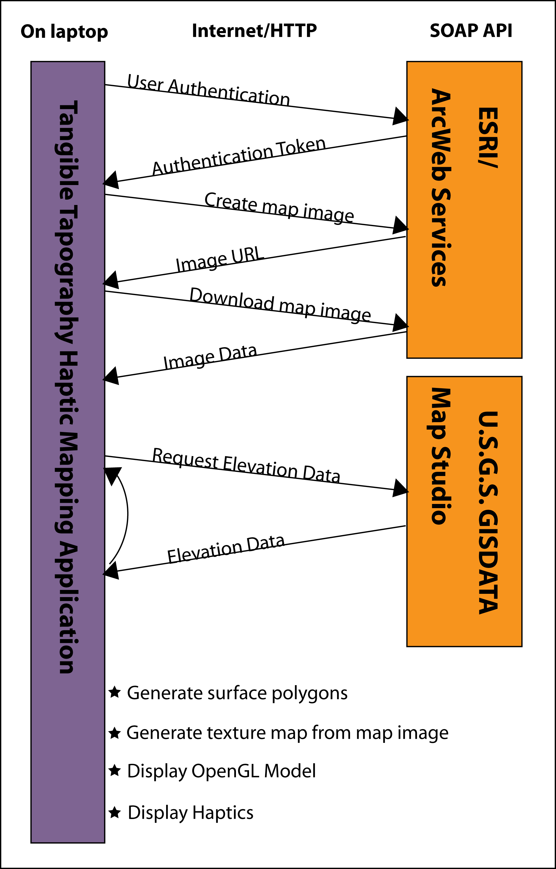 Introduction Haptics changes the way we interact with our computers. The continuing question is “what applications of haptics will be useful, and what benefits will we derive from this technology?” We think that haptics may have tremendous benefit to working with maps and GIS data. We present a web-service mashup that incorporates GIS data from several servers and renders the data both graphically and haptically for an enhanced user experience. Our application, Tangible Topography™ incorporates data from two different free GIS servers to generate a touchable haptic landscape based on real Earth data. The Phantom Omni by Sensable Inc. is used to interface with, i.e. touch, the map. The aim of this project is to give users a greater understanding of geographic regions by augmenting traditional maps with new sensory information. Traditional maps offer visual information alone; our haptic map allows users to trace the contours of an elevation map of a region displayed on a computer screen using the Omni’s stylus. |